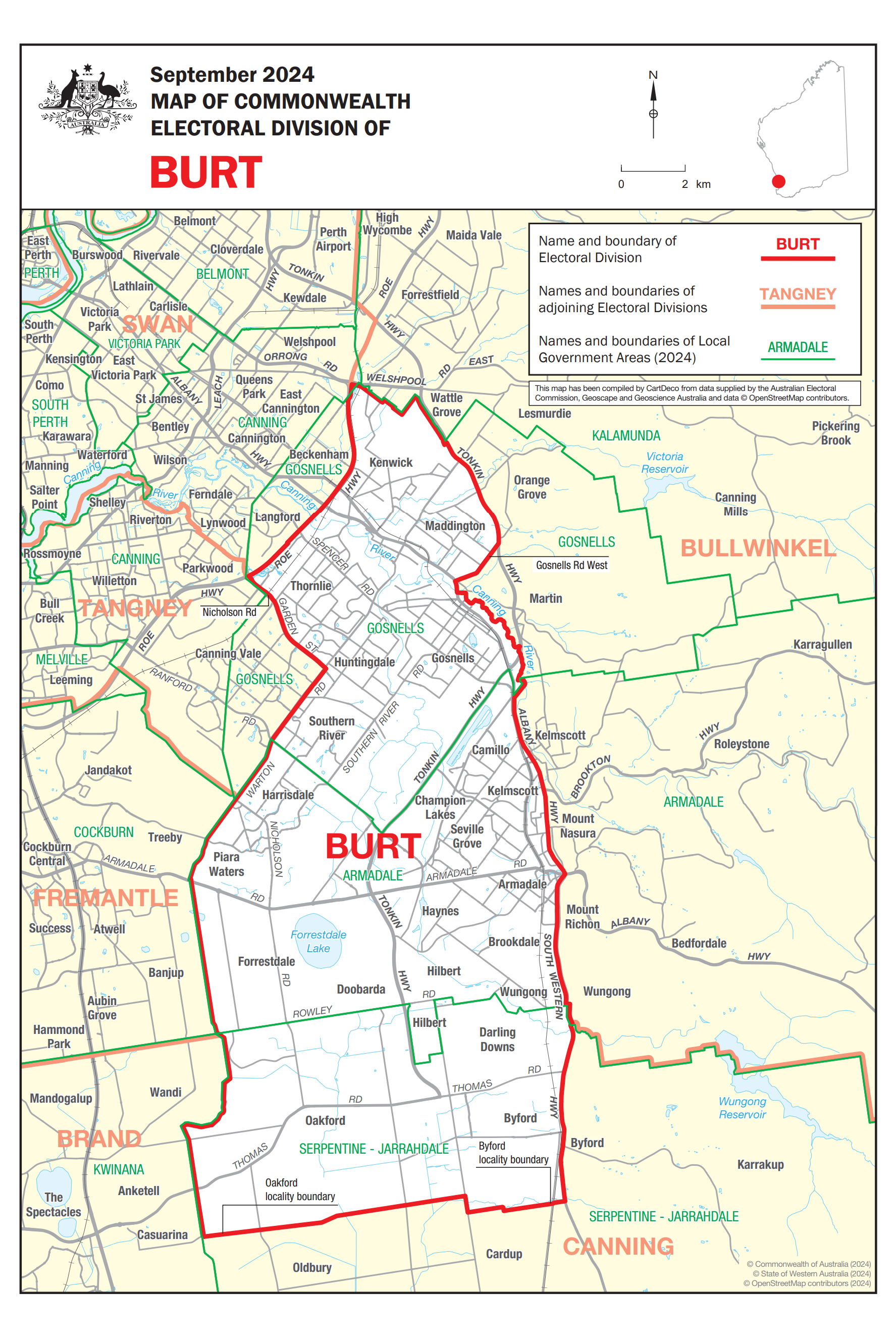 The Electorate of Burt is an outer metropolitan seat located in Perth’s south-eastern Suburbs.